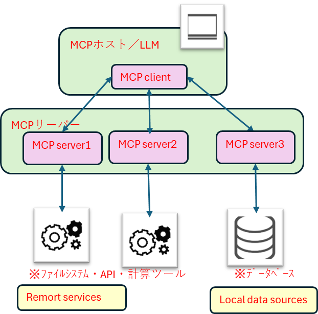 仕組みとしては「MCPホスト(PCなど)」に搭載された「MCPクライアント」が、受け取ったユーザーの指示を外部データソースやツールのアクセスを管理する「MCPサーバー」に伝えます。「MCPサーバー」は要求に応じた利用可能なリソースやツールなどの情報をやり取りし、外部システムと連携し処理を実行。その結果を「MCPクライアント」を介してユーザーに返す、という流れです。